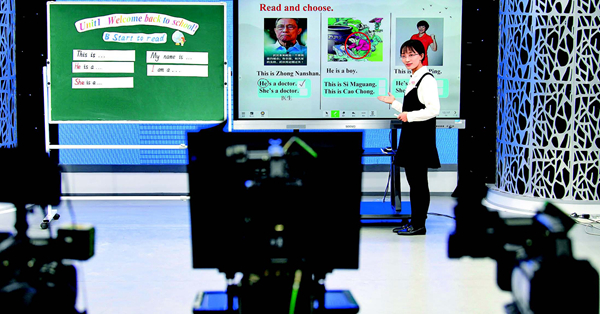 2月17日,寧夏銀川市金鳳區(qū)實(shí)驗(yàn)小學(xué)教師楊玉燕在錄制“空中課堂”四年級(jí)英語(yǔ)課程 馮開華攝