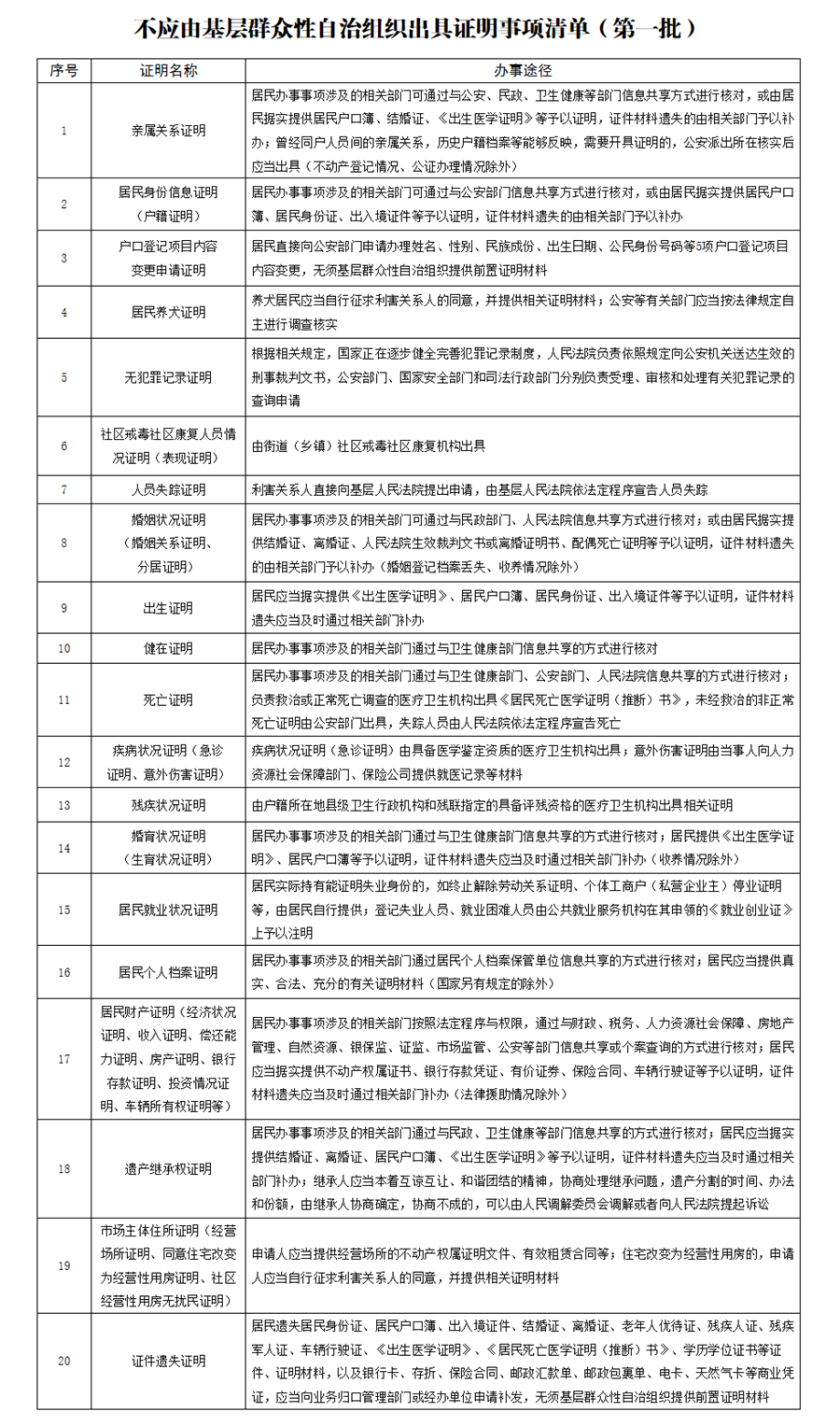 根據(jù)中共中央、國務(wù)院關(guān)于減證便民、優(yōu)化服務(wù)的部署要求,凡是沒有法律法規(guī)依據(jù)或未經(jīng)國務(wù)院批準(zhǔn)列入保留證明事項清單的證明事項,基層群眾性自治組織不予出具。對雖有法律法規(guī)依據(jù)但已經(jīng)不符合當(dāng)前經(jīng)濟社會發(fā)展實際的或基層群眾性自治組織沒有能力核實的,有關(guān)部門要在廣泛征求意見、充分調(diào)研論證的基礎(chǔ)上按程序提請修改法律法規(guī)規(guī)定,明確基層群眾性自治組織不再出具。根據(jù)國家有關(guān)法律法規(guī)規(guī)定,適時分批明確不應(yīng)由基層群眾性自治組織出具證明的事項。現(xiàn)明確《不應(yīng)由基層群眾性自治組織出具證明事項清單(第一批)》(見附件)。