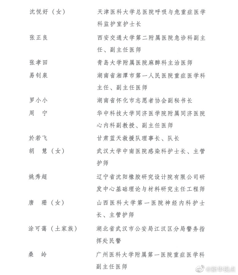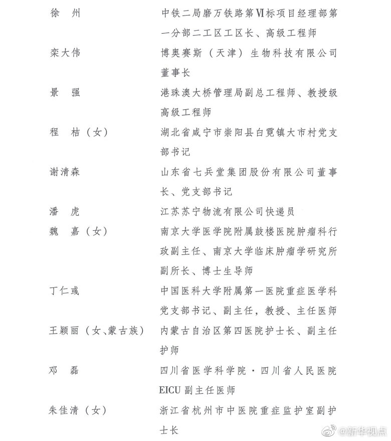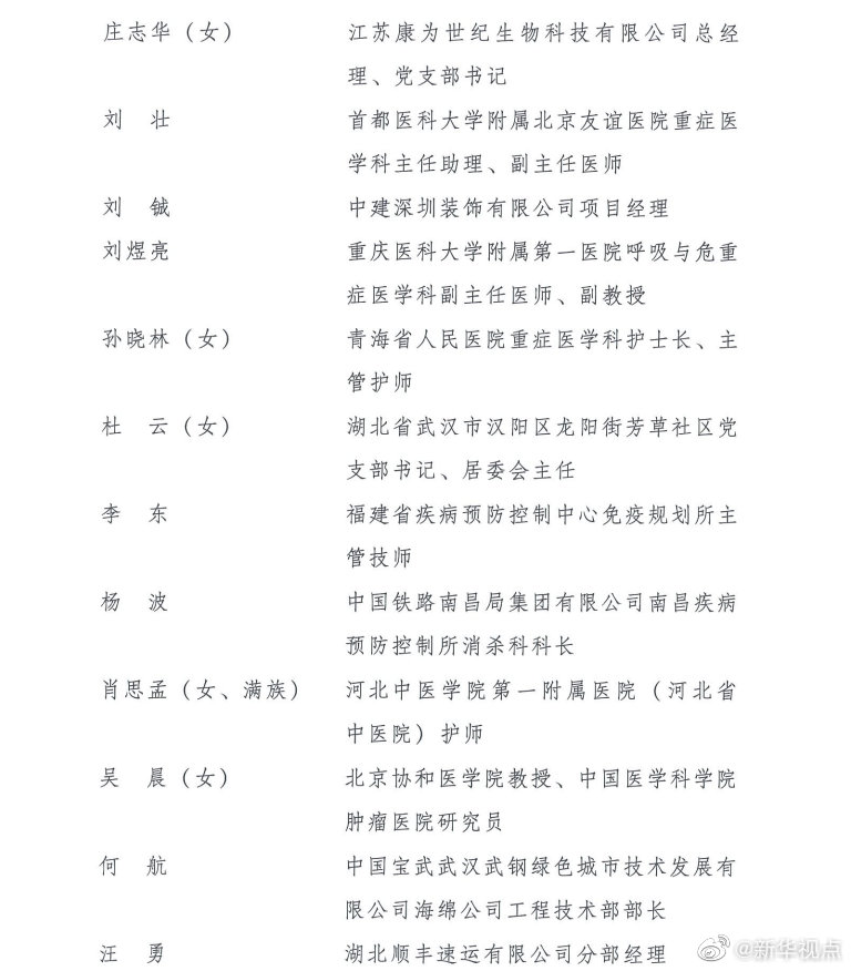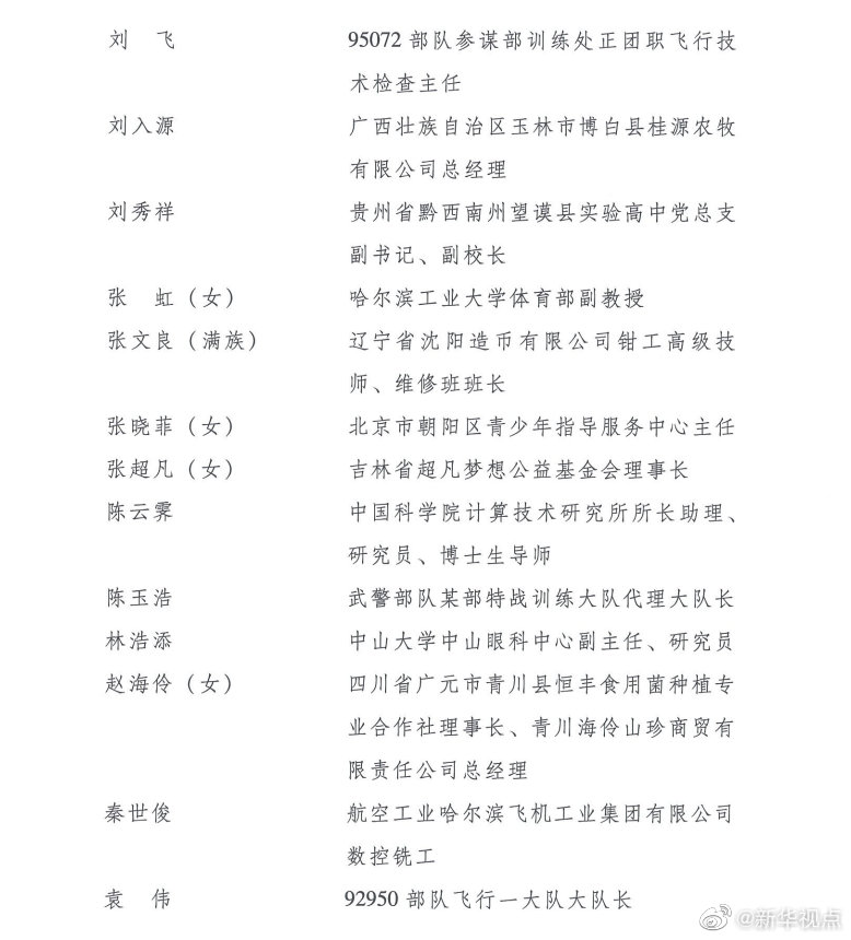 榮獲第24屆“中國青年五四獎?wù)隆钡姆謩e是:江蘇省南京市鼓樓區(qū)方家營消防救援站站長助理、三級消防長丁良浩,安徽省滁州市定遠縣吳圩鎮(zhèn)西孔村黨總支第一書記王萌萌(女),廈門大學(xué)航空航天學(xué)院常務(wù)副院長、特聘教授、博士生導(dǎo)師尤延鋮,湖北省黃岡市羅田縣希望小學(xué)校長方榮(女),浙江每日互動網(wǎng)絡(luò)科技股份有限公司董事長兼總經(jīng)理、黨委書記方毅,浙江省杭州市拱墅區(qū)職業(yè)高級中學(xué)美發(fā)專業(yè)教師石丹(女),國家超級計算無錫中心副主任付昊桓,中國石油大港油田公司第二采油廠作業(yè)二區(qū)注采二組副組長馮萌萌(女),寧夏回族自治區(qū)石嘴山市中醫(yī)醫(yī)院副主任醫(yī)師朱斌,中國國家女子排球隊隊員、隊長朱婷(女),95072部隊參謀部訓(xùn)練處正團職飛行技術(shù)檢查主任劉飛,廣西壯族自治區(qū)玉林市博白縣桂源農(nóng)牧有限公司總經(jīng)理劉入源,貴州省黔西南州望謨縣實驗高中黨總支副書記、副校長劉秀祥,哈爾濱工業(yè)大學(xué)體育部副教授張虹(女),遼寧省沈陽造幣有限公司鉗工高級技師、維修班班長張文良(滿族),北京市朝陽區(qū)青少年指導(dǎo)服務(wù)中心主任張曉菲(女),吉林省超凡夢想公益基金會理事長張超凡(女),中國科學(xué)院計算技術(shù)研究所所長助理、研究員、博士生導(dǎo)師陳云霽,武警部隊某部特戰(zhàn)訓(xùn)練大隊代理大隊長陳玉浩,中山大學(xué)中山眼科中心副主任、研究員林浩添,四川省廣元市青川縣恒豐食用菌種植專業(yè)合作社理事長、青川海伶山珍商貿(mào)有限責(zé)任公司總經(jīng)理趙海伶(女),航空工業(yè)哈爾濱飛機工業(yè)集團有限公司數(shù)控銑工秦世俊,92950部隊飛行一大隊大隊長袁偉,中鐵二局磨萬鐵路第Ⅵ標(biāo)項目經(jīng)理部第一分部二工區(qū)工區(qū)長、高級工程師徐州,博奧賽斯(天津)生物科技有限公司董事長欒大偉,港珠澳大橋管理局副總工程師、教授級高級工程師景強,湖北省咸寧市崇陽縣白霓鎮(zhèn)大市村黨支部書記程桔(女),山東省七兵堂集團股份有限公司董事長、黨支部書記謝清森,江蘇蘇寧物流有限公司快遞員潘虎,南京大學(xué)醫(yī)學(xué)院附屬鼓樓醫(yī)院腫瘤科行政副主任、南京大學(xué)臨床腫瘤學(xué)研究所副所長、博士生導(dǎo)師魏嘉(女),中國醫(yī)科大學(xué)附屬第一醫(yī)院重癥醫(yī)學(xué)科黨支部書記、副主任,教授、主任醫(yī)師丁仁彧,內(nèi)蒙古自治區(qū)第四醫(yī)院護士長、副主任護師王穎麗(女、蒙古族),四川省醫(yī)學(xué)科學(xué)院·四川省人民醫(yī)院EICU副主任醫(yī)師鄧磊,浙江省杭州市中醫(yī)院重癥監(jiān)護室副護士長朱佳清(女),江蘇康為世紀生物科技有限公司總經(jīng)理、黨支部書記莊志華(女),首都醫(yī)科大學(xué)附屬北京友誼醫(yī)院重癥醫(yī)學(xué)科主任助理、副主任醫(yī)師劉壯,中建深圳裝飾有限公司項目經(jīng)理劉鋮,重慶醫(yī)科大學(xué)附屬第一醫(yī)院呼吸與危重癥醫(yī)學(xué)科副主任醫(yī)師、副教授劉煜亮,青海省人民醫(yī)院重癥醫(yī)學(xué)科護士長、主管護師孫曉林(女),湖北省武漢市漢陽區(qū)龍陽街芳草社區(qū)黨支部書記、居委會主任杜云(女),福建省疾病預(yù)防控制中心免疫規(guī)劃所主管技師李東,中國鐵路南昌局集團有限公司南昌疾病預(yù)防控制所消殺科科長楊波,河北中醫(yī)學(xué)院第一附屬醫(yī)院(河北省中醫(yī)院)護師肖思孟(女、滿族),北京協(xié)和醫(yī)學(xué)院教授、中國醫(yī)學(xué)科學(xué)院腫瘤醫(yī)院研究員吳晨(女),中國寶武武漢武鋼綠色城市技術(shù)發(fā)展有限公司海綿公司工程技術(shù)部部長何航,湖北順豐速運有限公司分部經(jīng)理汪勇,天津醫(yī)科大學(xué)總醫(yī)院呼吸與危重癥醫(yī)學(xué)科監(jiān)護室護士長沈悅好(女),西安交通大學(xué)第二附屬醫(yī)院急診科副主任、副主任醫(yī)師張正良,青島大學(xué)附屬醫(yī)院麻醉科主治醫(yī)師張孝田,湖南省湘潭市第一人民醫(yī)院重癥醫(yī)學(xué)科主任、副主任醫(yī)師易釗泉,湖南省懷化市志愿者協(xié)會副秘書長羅小小,華中科技大學(xué)同濟醫(yī)學(xué)院附屬同濟醫(yī)院心內(nèi)科副教授、副主任醫(yī)師周寧,甘肅藍天救援隊理事長、隊長於若飛,武漢大學(xué)中南醫(yī)院感染科護士長、主管護師胡慧(女),遼寧省沈陽橡膠研究設(shè)計院有限公司研發(fā)中心基礎(chǔ)理論與材料研究主任工程師姚秀超,山西醫(yī)科大學(xué)第一醫(yī)院神經(jīng)內(nèi)科護士長、主管護師唐珊(女),湖北省武漢市公安局江漢區(qū)分局警務(wù)指揮處民警涂可藹(土家族),廣州醫(yī)科大學(xué)附屬第一醫(yī)院重癥醫(yī)學(xué)科副主任醫(yī)師桑嶺,湖北省武漢市第三醫(yī)院重癥醫(yī)學(xué)科副主任醫(yī)師董芳(女),東南大學(xué)附屬中大醫(yī)院重癥醫(yī)學(xué)科主任醫(yī)師潘純。