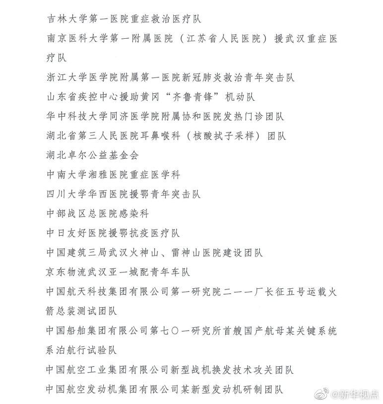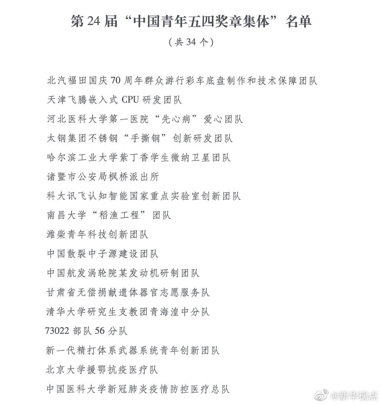 榮獲“中國青年五四獎?wù)录w”的分別是:北汽福田國慶70周年群眾游行彩車底盤制作和技術(shù)保障團隊,天津飛騰嵌入式CPU研發(fā)團隊,河北醫(yī)科大學(xué)第一醫(yī)院“先心病”愛心團隊,太鋼集團不銹鋼“手撕鋼”創(chuàng)新研發(fā)團隊,哈爾濱工業(yè)大學(xué)紫丁香學(xué)生微納衛(wèi)星團隊,諸暨市公安局楓橋派出所,科大訊飛認知智能國家重點實驗室創(chuàng)新團隊,南昌大學(xué)“稻漁工程”團隊,濰柴青年科技創(chuàng)新團隊,中國散裂中子源建設(shè)團隊,中國航發(fā)渦輪院某發(fā)動機研制團隊,甘肅省無償捐獻遺體器官志愿服務(wù)隊,清華大學(xué)研究生支教團青海湟中分隊,73022部隊56分隊,新一代精打體系武器系統(tǒng)青年創(chuàng)新團隊,北京大學(xué)援鄂抗疫醫(yī)療隊,中國醫(yī)科大學(xué)新冠肺炎疫情防控醫(yī)療總隊,吉林大學(xué)第一醫(yī)院重癥救治醫(yī)療隊,南京醫(yī)科大學(xué)第一附屬醫(yī)院(江蘇省人民醫(yī)院)援武漢重癥醫(yī)療隊,浙江大學(xué)醫(yī)學(xué)院附屬第一醫(yī)院新冠肺炎救治青年突擊隊,山東省疾控中心援助黃岡“齊魯青鋒”機動隊,華中科技大學(xué)同濟醫(yī)學(xué)院附屬協(xié)和醫(yī)院發(fā)熱門診團隊,湖北省第三人民醫(yī)院耳鼻喉科(核酸拭子采樣)團隊,湖北卓爾公益基金會,中南大學(xué)湘雅醫(yī)院重癥醫(yī)學(xué)科,四川大學(xué)華西醫(yī)院援鄂青年突擊隊,中部戰(zhàn)區(qū)總醫(yī)院感染科,中日友好醫(yī)院援鄂抗疫醫(yī)療隊,中國建筑三局武漢火神山、雷神山醫(yī)院建設(shè)團隊,京東物流武漢亞一城配青年車隊,中國航天科技集團有限公司第一研究院二一一廠長征五號運載火箭總裝測試團隊,中國船舶集團有限公司第七〇一研究所首艘國產(chǎn)航母某關(guān)鍵系統(tǒng)系泊航行試驗隊,中國航空工業(yè)集團有限公司新型戰(zhàn)機換發(fā)技術(shù)攻關(guān)團隊,中國航空發(fā)動機集團有限公司某新型發(fā)動機研制團隊。