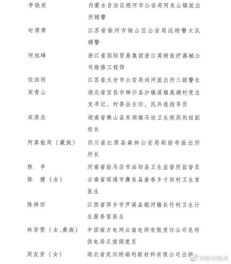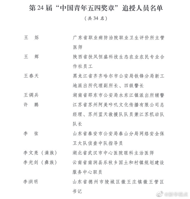 第24屆“中國青年五四獎?wù)隆弊肥谌藛T分別是:廣東省職業(yè)病防治院職業(yè)衛(wèi)生評價所主管醫(yī)師王爍,陜西省扶風(fēng)恒盛科技生態(tài)農(nóng)業(yè)農(nóng)民專業(yè)合作社員工王輝,黑龍江省齊齊哈爾市公安局鐵鋒分局新工地派出所代理副所長、四級警長王春天,湖南省邵東市公安局水東江鎮(zhèn)派出所輔警王調(diào)兵,江蘇省蘇州阿美咔嘰文化傳播有限公司總經(jīng)理、蘇州藍天救援隊隊員兼江蘇機動隊隊長許鵬,山東省泰安市公安局泰山分局網(wǎng)絡(luò)安全保衛(wèi)大隊偵查中隊指導(dǎo)員李弦,湖北省武漢市中心醫(yī)院眼科主治醫(yī)師李文亮(滿族),云南省南澗縣樂秋鄉(xiāng)國土和村鎮(zhèn)規(guī)劃建設(shè)服務(wù)中心職員李光劍(彝族),山東省德州市陵城區(qū)徽王莊鎮(zhèn)徽王管區(qū)書記李洪明,內(nèi)蒙古自治區(qū)根河市公安局阿龍山鎮(zhèn)派出所輔警李曉歡,江蘇省徐州市銅山區(qū)公安局巡特警大隊輔警時席席,浙江省國際貿(mào)易集團浙江英特醫(yī)療器械公司維修工程師何旭峰,江蘇省太倉市公安局瀏河派出所三級警長位洪明,湖北省宜昌市秭歸縣沙鎮(zhèn)溪鎮(zhèn)高潮村黨總支書記、村委會主任、民兵連指導(dǎo)員宋青山,湖南省衡山縣東湖鎮(zhèn)馬跡衛(wèi)生院藥劑組副組長宋英杰,四川省紅原縣森林公安局刷經(jīng)寺派出所所長阿真能周(藏族),河南省駐馬店市泌陽縣衛(wèi)生監(jiān)督所監(jiān)督員陳申,云南省昭通市彝良縣奎香鄉(xiāng)寸田村衛(wèi)生室醫(yī)生陳?。ㄅ魇∑监l(xiāng)市蘆溪縣銀河鎮(zhèn)長竹村衛(wèi)生計生服務(wù)室醫(yī)生陳祥田,中國南方電網(wǎng)云南電網(wǎng)有限責(zé)任公司昆明供電局正值調(diào)度員林芳雯(女、彝族),湖北省武漢特瑞利新材料有限公司出納周友芳(女),安徽省銅陵市樅陽縣公安局特(巡)警大隊輔警一中隊副隊長胡鋒,四川省甘孜藏族自治州得榮縣龍絨寺寺廟管理委員會主任洛絨益西(藏族),四川省廣元經(jīng)開區(qū)盤龍鎮(zhèn)深溝村村民宮高明,江蘇省南京市公安局高淳分局淳溪派出所輔警袁劍雄,山東省泰安市岱岳區(qū)角峪鎮(zhèn)先鋒村村民賈慶臣,湖北省武漢市蔡甸區(qū)人民醫(yī)院住院醫(yī)師夏思思(女),江蘇省南京市公安局行政審批服務(wù)處網(wǎng)絡(luò)政務(wù)科一級警員徐昊,江蘇省徐州市沛縣公安局五段派出所輔警章良志,湖北省武漢市江夏區(qū)第一人民醫(yī)院醫(yī)師彭銀華,廣東省英德市公安局橋頭派出所輔警曾文聰,江西省蓮花縣湖上鄉(xiāng)中心衛(wèi)生院醫(yī)生熊波,河南省鄭州市公安局東風(fēng)路分局治安管理服務(wù)大隊三中隊民警、四級警長樊樹鋒,甘肅省舟曲縣扶貧辦副主任張小娟(女、藏族)。