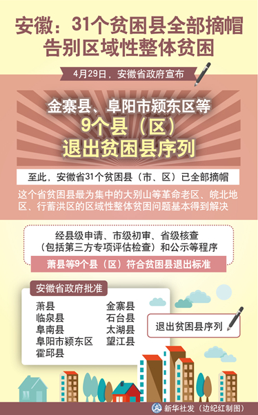 新華社合肥4月29日電(記者姜剛)29日,安徽省政府宣布,金寨縣、阜陽市潁東區(qū)等9個縣(區(qū))退出貧困縣序列。至此,安徽省31個貧困縣(市、區(qū))已全部摘帽,這個省貧困縣最為集中的大別山等革命老區(qū)、皖北地區(qū)、行蓄洪區(qū)的區(qū)域性整體貧困問題基本得到解決。