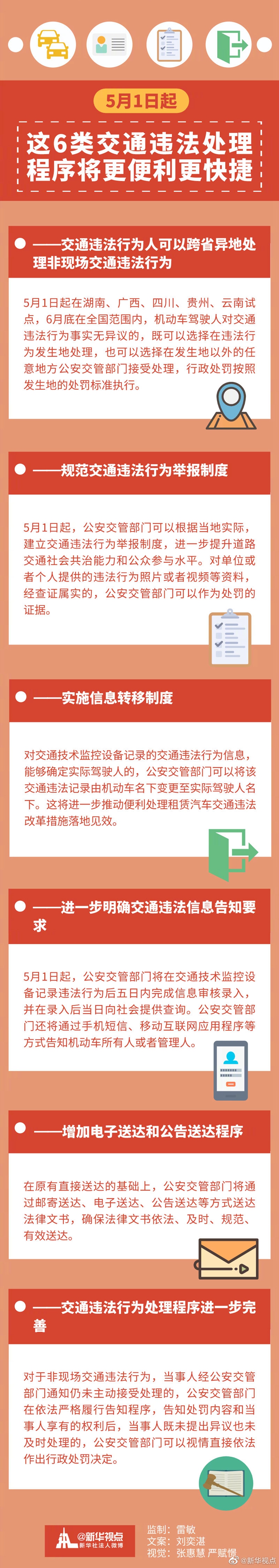 公安部修訂的《道路交通安全違法行為處理程序規(guī)定》將于5月1日起正式實施,實施后,處理交通違法將有6個變化,群眾辦事更便利、更快捷。詳情請看↓