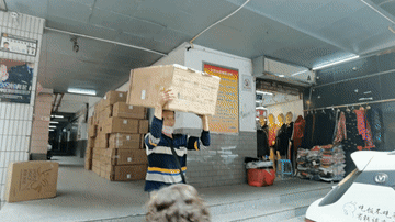一小時(shí)后,一輛貨車駛進(jìn)狹窄的街區(qū),停在十幾米遠(yuǎn)外。冉光輝瞬間抖擻起精神,移下一個(gè)近半人高的箱子放到左邊肩頭,兩臂環(huán)抱貨物,小跑著往車上運(yùn)送。專職做“棒棒”多年,這一套程序他再熟悉不過(guò)。