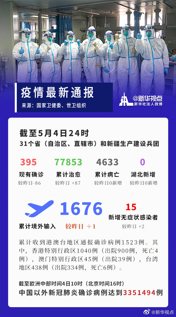 截至5月4日24時,據(jù)31個?。ㄗ灾螀^(qū)、直轄市)和新疆生產(chǎn)建設(shè)兵團(tuán)報(bào)告,現(xiàn)有確診病例395例(其中重癥病例29例),累計(jì)治愈出院病例77853例,累計(jì)死亡病例4633例,累計(jì)報(bào)告確診病例82881例,現(xiàn)有疑似病例2例。累計(jì)追蹤到密切接觸者735240人,尚在醫(yī)學(xué)觀察的密切接觸者7152人。