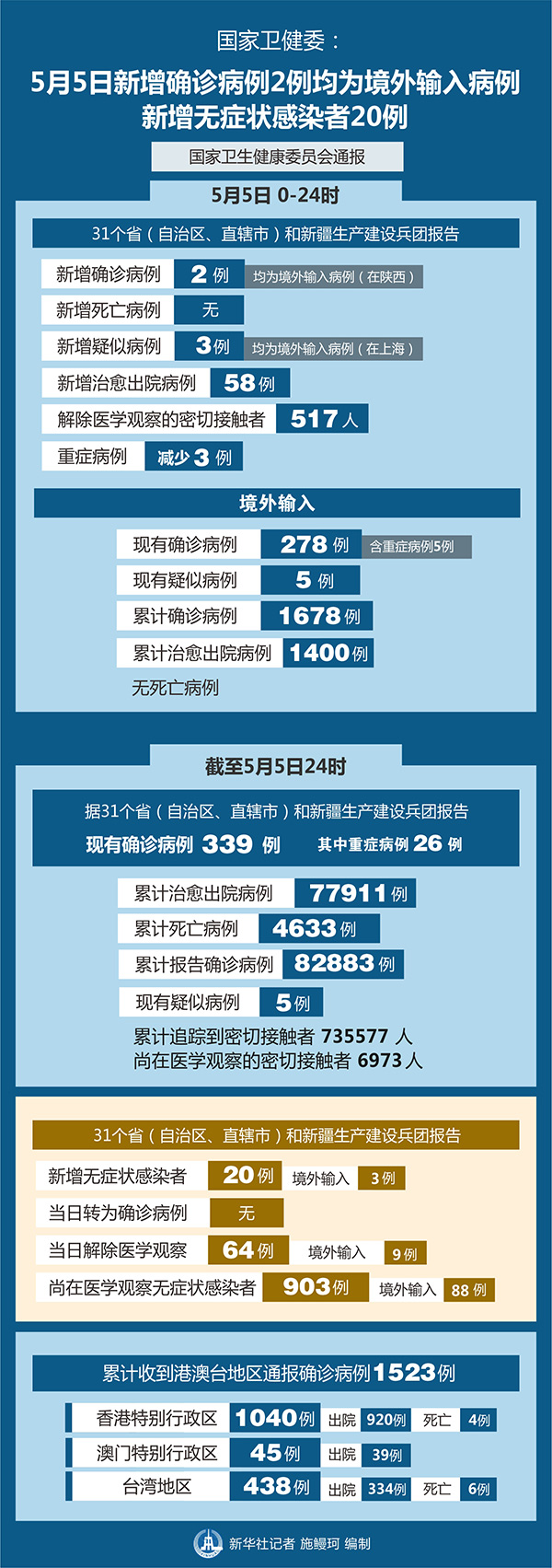 截至5月5日24時(shí),據(jù)31個(gè)?。ㄗ灾螀^(qū)、直轄市)和新疆生產(chǎn)建設(shè)兵團(tuán)報(bào)告,現(xiàn)有確診病例339例(其中重癥病例26例),累計(jì)治愈出院病例77911例,累計(jì)死亡病例4633例,累計(jì)報(bào)告確診病例82883例,現(xiàn)有疑似病例5例。累計(jì)追蹤到密切接觸者735577人,尚在醫(yī)學(xué)觀察的密切接觸者6973人。