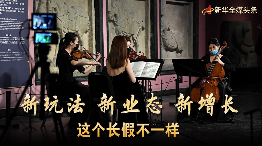5月2日晚,通過網(wǎng)絡(luò)直播的“云上國寶”音樂會在西安碑林博物館奏響。這是4月28日,西安交響樂團(tuán)“弦上莫奈四重奏”為音樂會彩排。 新華社記者 李一博 攝
