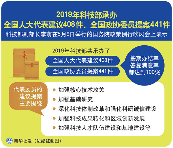 新華社北京5月9日電(記者張泉、董瑞豐)科技部副部長李萌在9日舉行的國務(wù)院政策例行吹風(fēng)會上表示,去年科技部共承辦了全國人大代表建議408件、全國政協(xié)委員提案441件,按期辦結(jié)率和答復(fù)滿意率都達到100%。