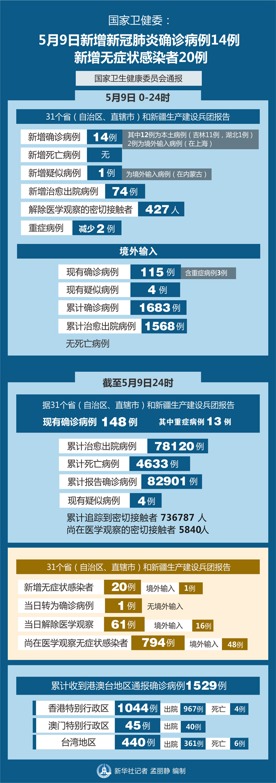 截至5月9日24時,據(jù)31個省(自治區(qū)、直轄市)和新疆生產(chǎn)建設(shè)兵團(tuán)報告,現(xiàn)有確診病例148例(其中重癥病例13例),累計治愈出院病例78120例,累計死亡病例4633例,累計報告確診病例82901例,現(xiàn)有疑似病例4例。累計追蹤到密切接觸者736787人,尚在醫(yī)學(xué)觀察的密切接觸者5840人。