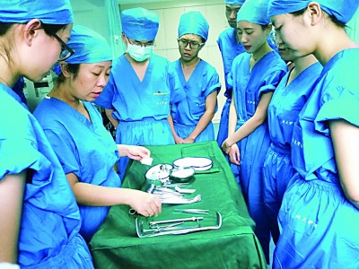 手術(shù)的順利進(jìn)展離不開器械護(hù)士的準(zhǔn)確傳遞。圖為北京大學(xué)護(hù)理學(xué)院學(xué)生正在老師引導(dǎo)下認(rèn)識手術(shù)器械。李珂攝/光明圖片