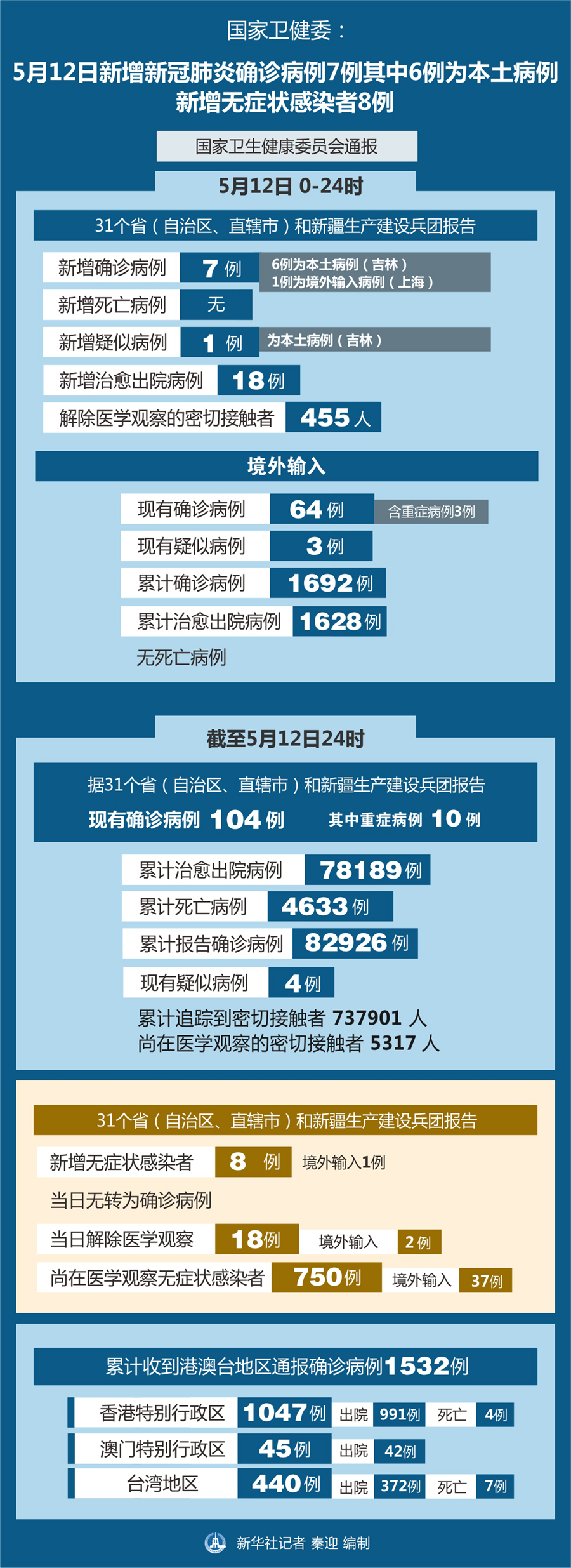 截至5月12日24時,據(jù)31個?。ㄗ灾螀^(qū)、直轄市)和新疆生產(chǎn)建設兵團報告,現(xiàn)有確診病例104例(其中重癥病例10例),累計治愈出院病例78189例,累計死亡病例4633例,累計報告確診病例82926例,現(xiàn)有疑似病例4例。累計追蹤到密切接觸者737901人,尚在醫(yī)學觀察的密切接觸者5317人。