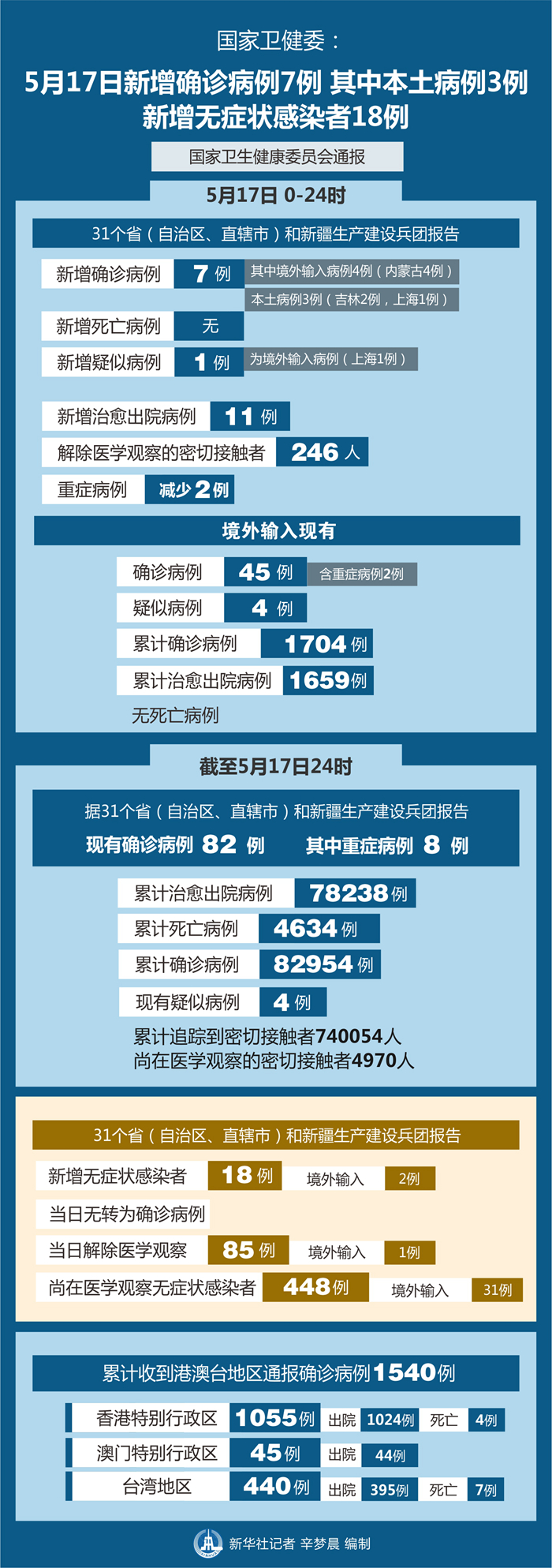 圖表:國家衛(wèi)健委:5月17日新增確診病例7例 其中本土病例3例 新增無癥狀感染者18例 新華社記者 辛夢晨 編制