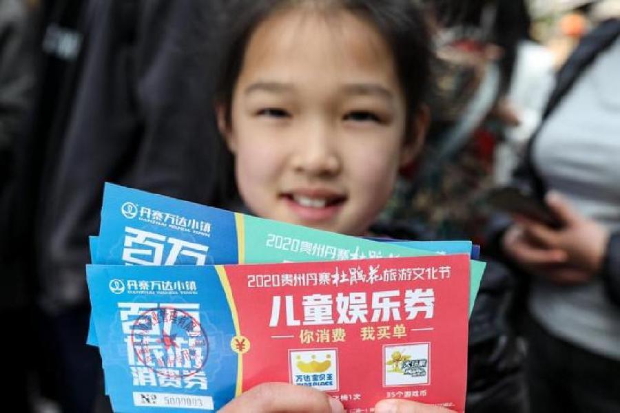 一名兒童在貴州丹寨萬達小鎮(zhèn)展示領(lǐng)取到的旅游消費券 歐東衢 攝
