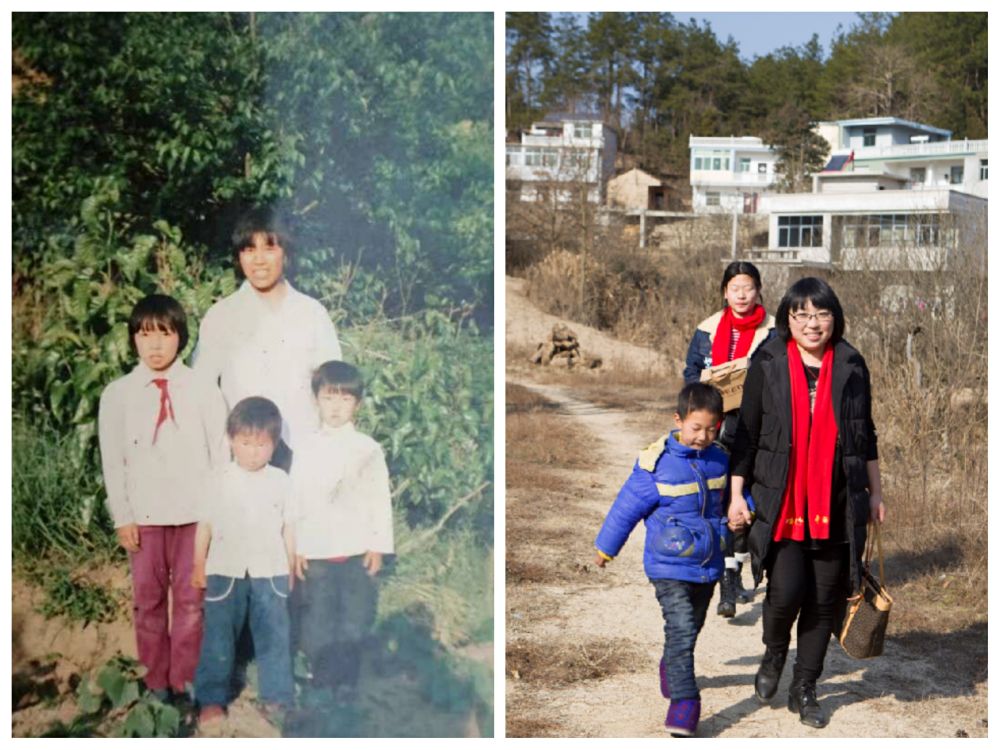 拼版照片左圖:10歲的周玉梅(左一)與家人在金寨縣花石鄉(xiāng)竺山村合影。(翻拍照片,受訪者提供)右圖:2017年1月,周玉梅(前排右一)在金寨縣吳家店鎮(zhèn)為貧困學(xué)生送助學(xué)金和新年禮物(受訪者提供)。