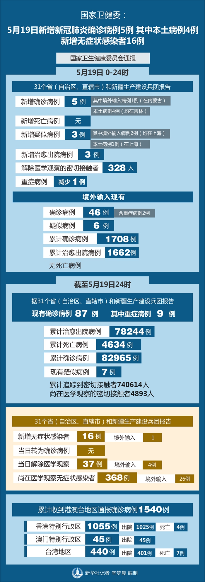 截至5月19日24時,據(jù)31個?。ㄗ灾螀^(qū)、直轄市)和新疆生產(chǎn)建設(shè)兵團(tuán)報告,現(xiàn)有確診病例87例(其中重癥病例9例),累計治愈出院病例78244例,累計死亡病例4634例,累計報告確診病例82965例,現(xiàn)有疑似病例7例。累計追蹤到密切接觸者740614人,尚在醫(yī)學(xué)觀察的密切接觸者4893人。