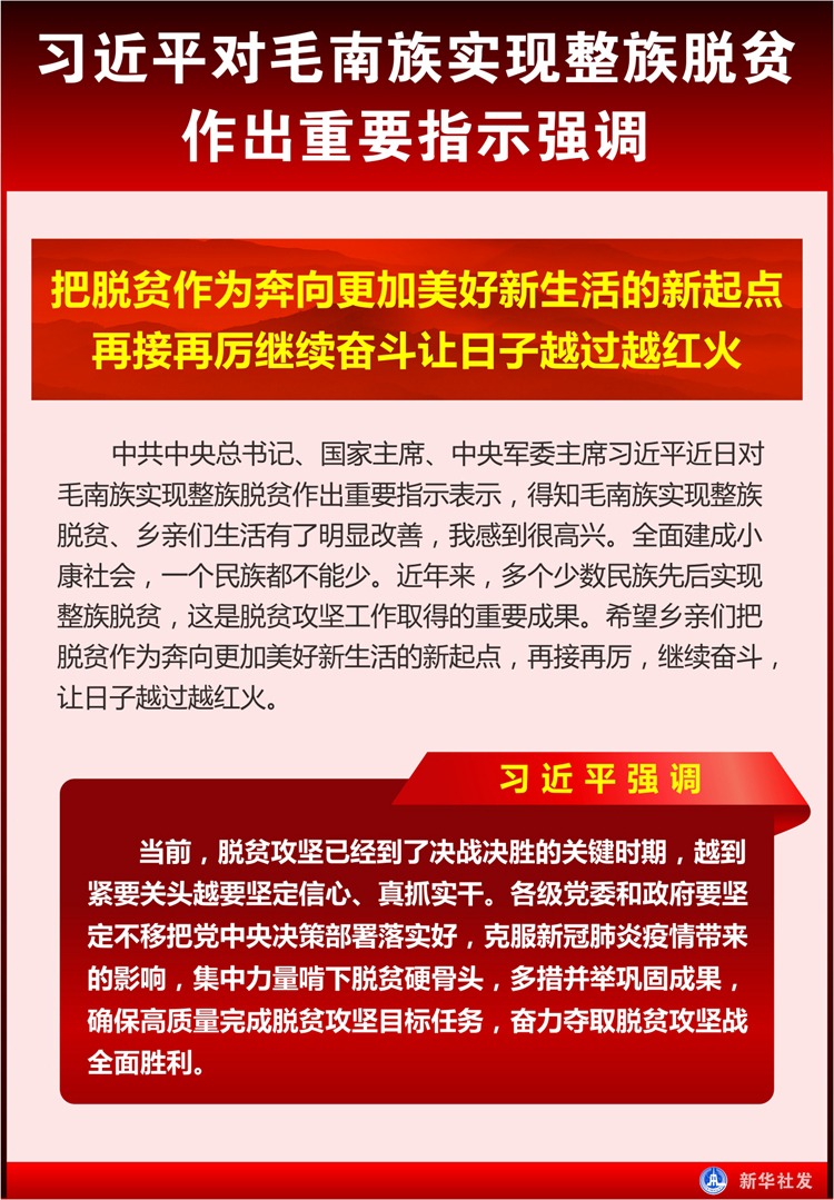 新華社北京5月20日電? 中共中央總書記、國家主席、中央軍委主席習近平近日對毛南族實現整族脫貧作出重要指示表示,得知毛南族實現整族脫貧、鄉(xiāng)親們生活有了明顯改善,我感到很高興。全面建成小康社會,一個民族都不能少。近年來,多個少數民族先后實現整族脫貧,這是脫貧攻堅工作取得的重要成果。希望鄉(xiāng)親們把脫貧作為奔向更加美好新生活的新起點,再接再厲,繼續(xù)奮斗,讓日子越過越紅火。