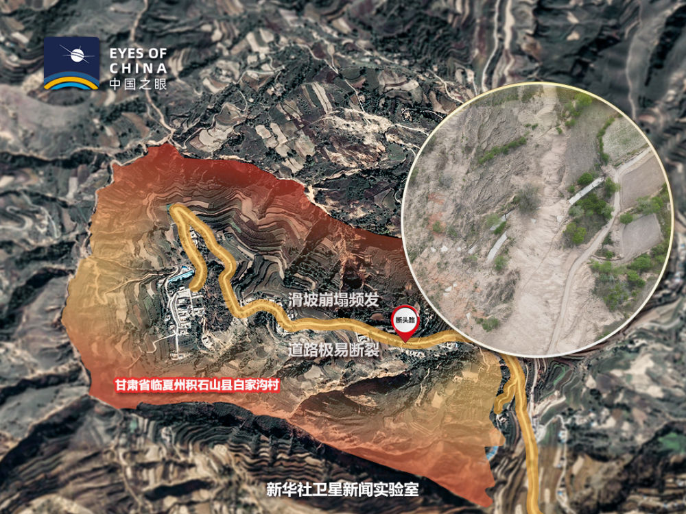 白家溝村地處濕陷性黃土滑坡帶。從衛(wèi)星看,整個(gè)村子山峰陡峭,基巖裸露,難以找到一塊成片的平地。人只能見縫插針式地居住在疏松、干裂的黃土地上。一條崎嶇的路像絲帶一樣“搭”在懸崖峭壁上,隨時(shí)有掉下來的危險(xiǎn)。