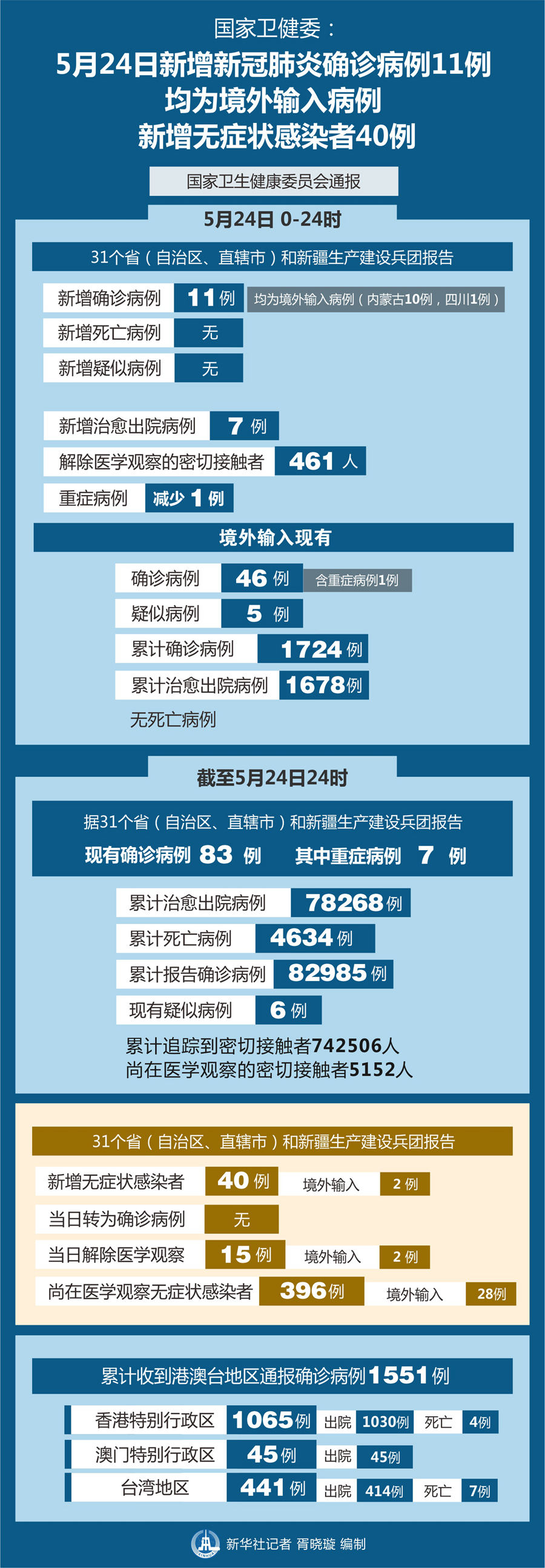 截至5月24日24時,據(jù)31個?。ㄗ灾螀^(qū)、直轄市)和新疆生產(chǎn)建設(shè)兵團報告,現(xiàn)有確診病例83例(其中重癥病例7例),累計治愈出院病例78268例,累計死亡病例4634例,累計報告確診病例82985例,現(xiàn)有疑似病例6例。累計追蹤到密切接觸者742506人,尚在醫(yī)學(xué)觀察的密切接觸者5152人。