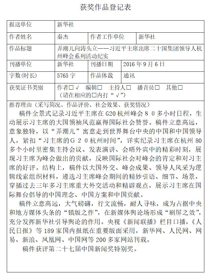 秦杰同志長期承擔(dān)中央主要領(lǐng)導(dǎo)同志的采訪報(bào)道任務(wù)。無論在條件艱苦的青藏高原,還是在行程萬里日程頻密的高訪之中,他都能不辭辛苦、日夜奮戰(zhàn),以高度的政治責(zé)任感和精益求精的職業(yè)精神出色完成任務(wù)。他參與采寫的《更高舉起改革開放偉大旗幟——寫在鄧小平同志誕辰110周年之際》和牽頭采寫的《弄潮兒向濤頭立——習(xí)近平主席出席二十國集團(tuán)領(lǐng)導(dǎo)人杭州峰會系列活動紀(jì)實(shí)》獲得中國新聞最高獎——中國新聞獎特別獎,參與撰寫的《中共高層新陣容》被譽(yù)為中國領(lǐng)導(dǎo)人對外報(bào)道的開創(chuàng)性作品并獲中國新聞獎一等獎。他采寫的《歷史見證承諾》《一枝一葉總關(guān)情》等報(bào)道成為時(shí)政報(bào)道領(lǐng)域不可多得的精品。