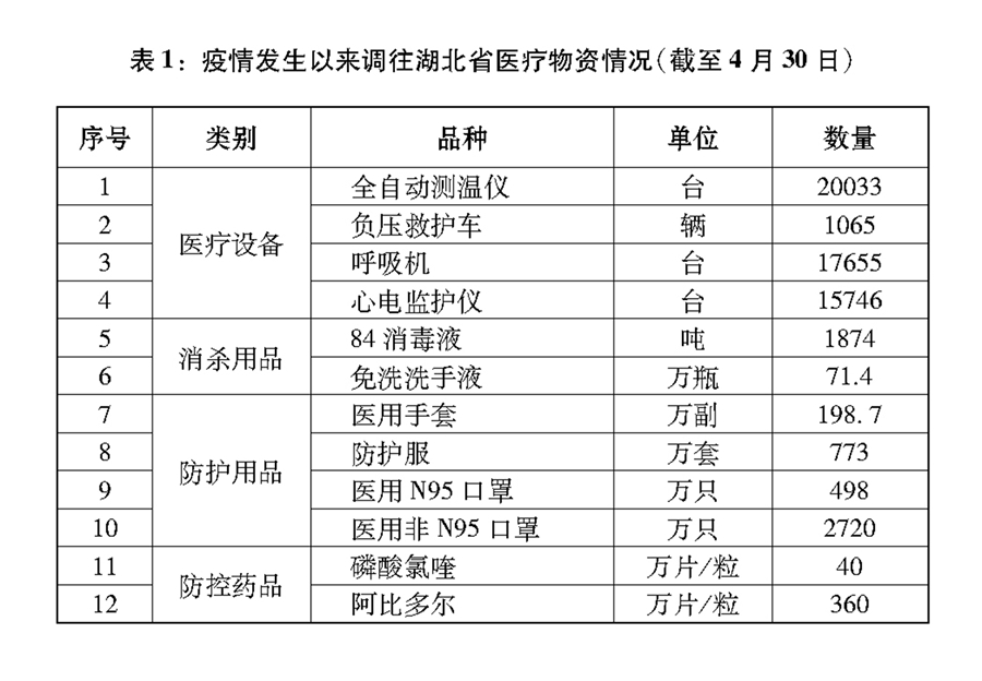 開展新中國成立以來規(guī)模最大的醫(yī)療支援行動。調(diào)動全國醫(yī)療資源和力量,全力支持湖北省和武漢市醫(yī)療救治。自1月24日除夕至3月8日,全國共調(diào)集346支國家醫(yī)療隊、4.26萬名醫(yī)務(wù)人員、900多名公共衛(wèi)生人員馳援湖北。19個省份以對口支援、以省包市的方式支援湖北省除武漢市以外16個地市,各省在發(fā)生疫情、防控救治任務(wù)十分繁重的情況下,集中優(yōu)質(zhì)醫(yī)療資源支援湖北省和武漢市。人民解放軍派出4000多名醫(yī)務(wù)人員支援湖北,承擔(dān)火神山醫(yī)院等3家醫(yī)療機構(gòu)的醫(yī)療救治任務(wù),空軍出動運輸機緊急運送醫(yī)療物資。各醫(yī)療隊從接受指令到組建2小時內(nèi)完成,24小時內(nèi)抵達,并自帶7天防護物資,抵達后迅速開展救治。在全國緊急調(diào)配全自動測溫儀、負壓救護車、呼吸機、心電監(jiān)護儀等重點醫(yī)療物資支援湖北省和武漢市(表1)。從全國調(diào)集4萬名建設(shè)者和幾千臺機械設(shè)備,僅用10天建成有1000張病床的火神山醫(yī)院,僅用12天建成有1600張病床的雷神山醫(yī)院。短短10多天建成16座方艙醫(yī)院,共有1.4萬余張床位。加強臨床血液供應(yīng),10個省份無償支援湖北省紅細胞4.5萬單位,血小板1762個治療量,新鮮冰凍血漿137萬毫升(不含恢復(fù)期血漿)。大規(guī)模、強有力的醫(yī)療支援行動,有力保障了湖北省和武漢市救治,極大緩解了重災(zāi)區(qū)醫(yī)療資源嚴重不足的壓力。