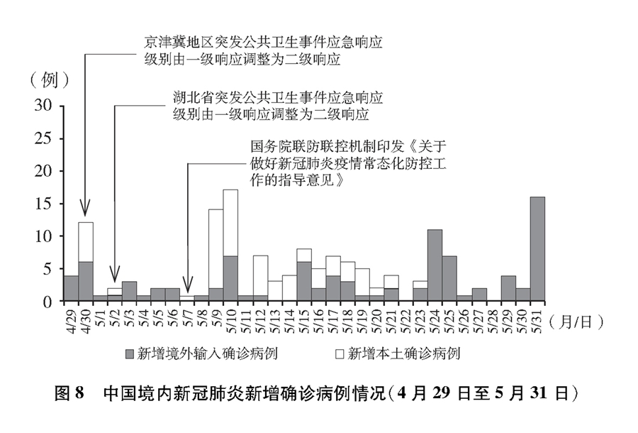 境內(nèi)疫情總體呈零星散發(fā)狀態(tài),局部地區(qū)出現(xiàn)散發(fā)病例引起的聚集性疫情,境外輸入病例基本得到控制,疫情積極向好態(tài)勢持續(xù)鞏固,全國疫情防控進入常態(tài)化。加大力度推進復(fù)工復(fù)產(chǎn)復(fù)學(xué),常態(tài)化防控措施經(jīng)受“五一”假期考驗。經(jīng)中共中央批準,國務(wù)院聯(lián)防聯(lián)控機制派出聯(lián)絡(luò)組,繼續(xù)加強湖北省疫情防控。(圖8)