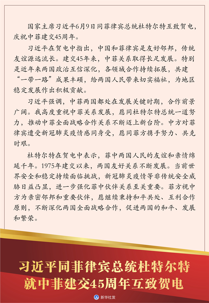 新華社北京6月9日電 國(guó)家主席習(xí)近平6月9日同菲律賓總統(tǒng)杜特爾特互致賀電,慶祝中菲建交45周年。