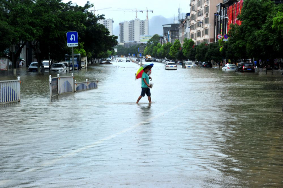 6月5日,在廣西羅城仫佬族自治縣解放路一積水區(qū)域,人們涉水出行。(新華社發(fā))