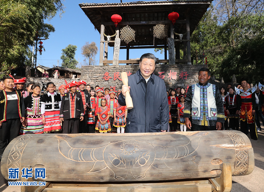 今年1月19日,正在云南考察的習(xí)近平來到騰沖市清水鄉(xiāng)三家村中寨司莫拉佤族村。司莫拉,佤語意為“幸福的地方”。習(xí)近平說,在大家努力下,你們這里已經(jīng)實現(xiàn)脫貧并正向新的發(fā)展目標(biāo)努力邁進(jìn),可喜可賀。全面建成小康社會之后要全面推進(jìn)鄉(xiāng)村振興,讓幸福的佤族村更加幸福!按照當(dāng)?shù)亓?xí)俗,習(xí)近平拿起鼓棒,敲響三聲木鼓,祝福風(fēng)調(diào)雨順、國泰民安、四海升平,并向鄉(xiāng)親們致以新春祝福。