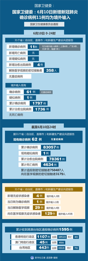 新華社北京6月11日電(記者陳聰)據(jù)國家衛(wèi)生健康委員會11日通報,6月10日0-24時,31個省(自治區(qū)、直轄市)和新疆生產(chǎn)建設(shè)兵團報告新增新冠肺炎確診病例11例,均為境外輸入病例(上海6例,廣東3例,天津1例,福建1例);無新增死亡病例;無新增疑似病例。