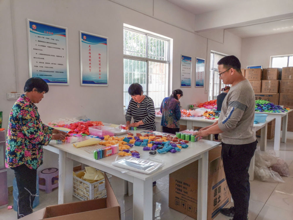山東省濟(jì)南市平陰縣返鄉(xiāng)創(chuàng)業(yè)青年宋京偉(右一)帶領(lǐng)村民在公司車間分裝太空泥