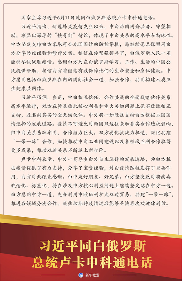 習近平指出,新冠肺炎疫情發(fā)生以來,中白兩國同舟共濟、守望相助,彰顯出深厚的“鐵哥們”情誼,體現(xiàn)了中白關(guān)系的高水平和特殊性。中方堅定支持白方采取符合本國國情的防控舉措,愿繼續(xù)毫無保留同白方分享防控經(jīng)驗和診療方案。相信在你堅強領(lǐng)導下,白俄羅斯人民一定能夠盡快戰(zhàn)勝疫情。感謝白方為在白俄羅斯學習、工作、生活的中國公民提供幫助,相信白方將繼續(xù)有效保障他們的生命安全和身體健康。中方愿同包括白俄羅斯在內(nèi)的國際社會一道,加強合作,共同構(gòu)建人類衛(wèi)生健康共同體。