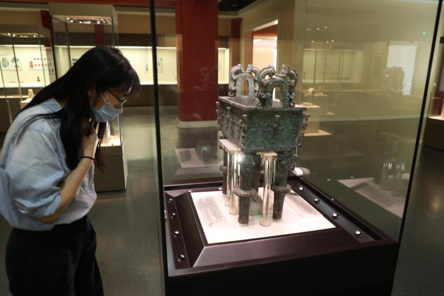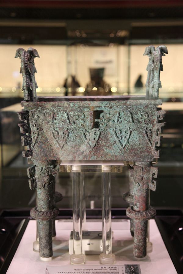 “從形制大小來看,有別于三足圓鼎,這件四足方鼎應(yīng)該是西周早期貴族所用的器物。方鼎高50.7厘米、口徑23.36厘米、重26公斤。方鼎的腹部內(nèi)壁上清晰地鑄有‘大保鑄’三字銘文。據(jù)考證,這‘大?!制鋵?shí)應(yīng)該為‘太?!虼诉@件方鼎被稱作太保鼎。”陳卓說。