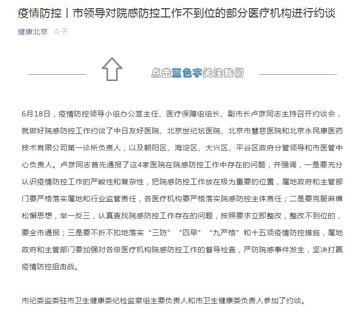 據(jù)北京市衛(wèi)健委微信公眾號消息,6月18日,疫情防控領(lǐng)導(dǎo)小組辦公室主任、醫(yī)療保障組組長、副市長盧彥同志主持召開約談會,就做好院感防控工作約談了中日友好醫(yī)院、北京世紀(jì)壇醫(yī)院、北京市慧慈醫(yī)院和北京永民康醫(yī)藥技術(shù)有限公司第一診所負責(zé)人,以及朝陽區(qū)、海淀區(qū)、大興區(qū)、平谷區(qū)政府分管領(lǐng)導(dǎo)和市醫(yī)管中心負責(zé)人。
