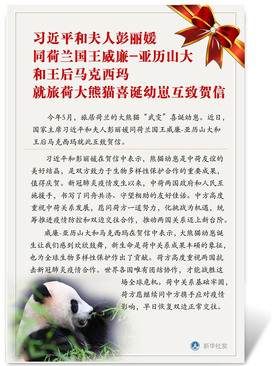 習(xí)近平和彭麗媛在賀信中表示,熊貓幼崽是中荷友誼的美好結(jié)晶,是雙方致力于生物多樣性保護合作的重要成果,值得慶賀。新冠肺炎疫情發(fā)生以來,中荷兩國政府和人民互施援手,書寫了同舟共濟、守望相助的友好佳話。中方高度重視中荷關(guān)系發(fā)展,愿同荷方一道努力,化挑戰(zhàn)為機遇,統(tǒng)籌推進疫情防控和雙邊交往合作,推動兩國關(guān)系邁上新臺階。