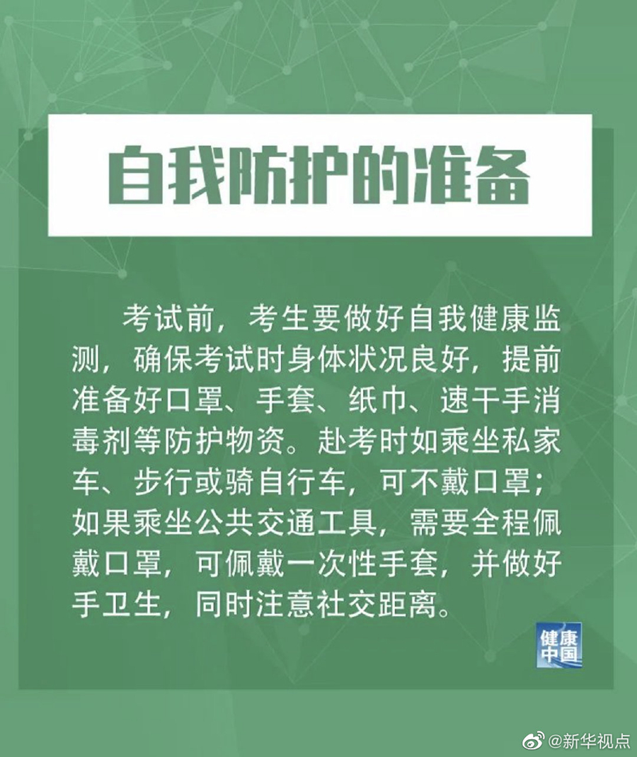 措施提到,低風(fēng)險(xiǎn)地區(qū)的考生在進(jìn)入考場前要佩戴口罩,進(jìn)入考場就座后,可以自主決定是否佩戴;備用隔離考場和中高風(fēng)險(xiǎn)地區(qū)的考生,要全程佩戴口罩。工作人員和監(jiān)考人員全程佩戴口罩,隔離考場的監(jiān)考員及工作人員須穿戴工作服、醫(yī)用防護(hù)口罩和一次性手套等,必要時(shí)可穿戴防護(hù)服。