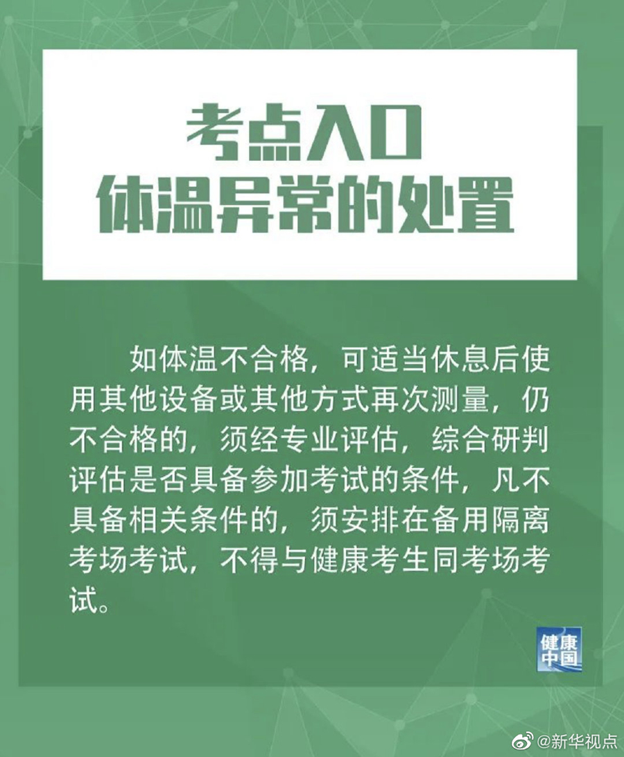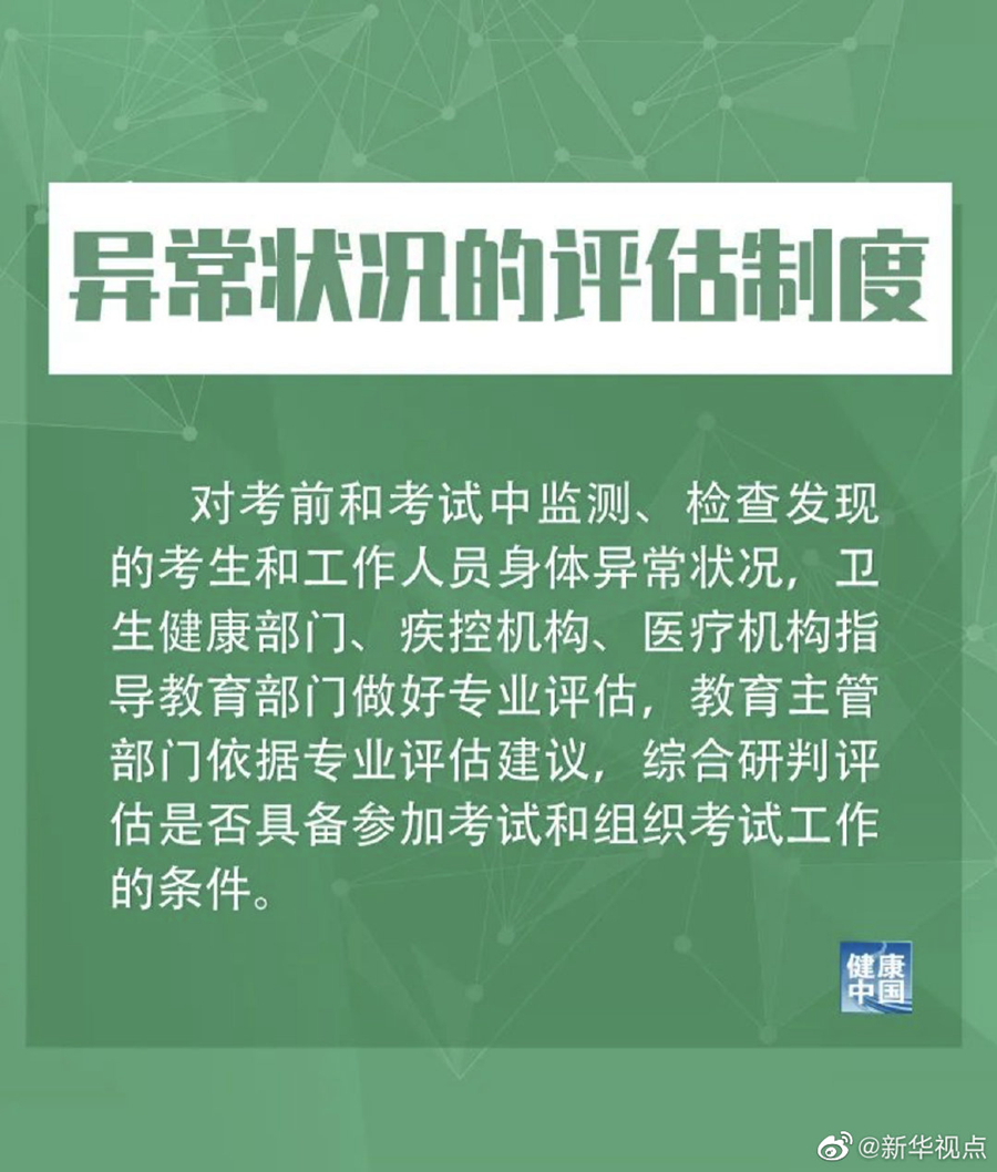 考試過程中有發(fā)熱、咳嗽等呼吸道癥狀者,措施提到,由考點(diǎn)當(dāng)?shù)氐男l(wèi)生健康部門、疾控機(jī)構(gòu)和醫(yī)療機(jī)構(gòu)專業(yè)人員進(jìn)行個(gè)案研判,具備繼續(xù)完成考試條件的考生,須安排在備用隔離考場考試。考生從普通考場轉(zhuǎn)移至備用隔離考場(未出考點(diǎn))所耽誤的時(shí)間,經(jīng)省級招生考試機(jī)構(gòu)批準(zhǔn)予以補(bǔ)齊。當(dāng)科目考試結(jié)束時(shí),由負(fù)責(zé)研判的專業(yè)人員當(dāng)場簡要向所有考生進(jìn)行解釋和說明,避免其他考生恐慌。