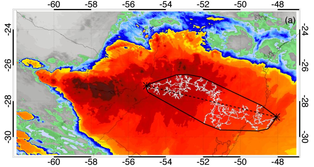 衛(wèi)星照片:?jiǎn)未伍L(zhǎng)度最長(zhǎng)閃電2018年10月31日發(fā)生在巴西南部。(圖片來(lái)源:世界氣象組織網(wǎng)站)