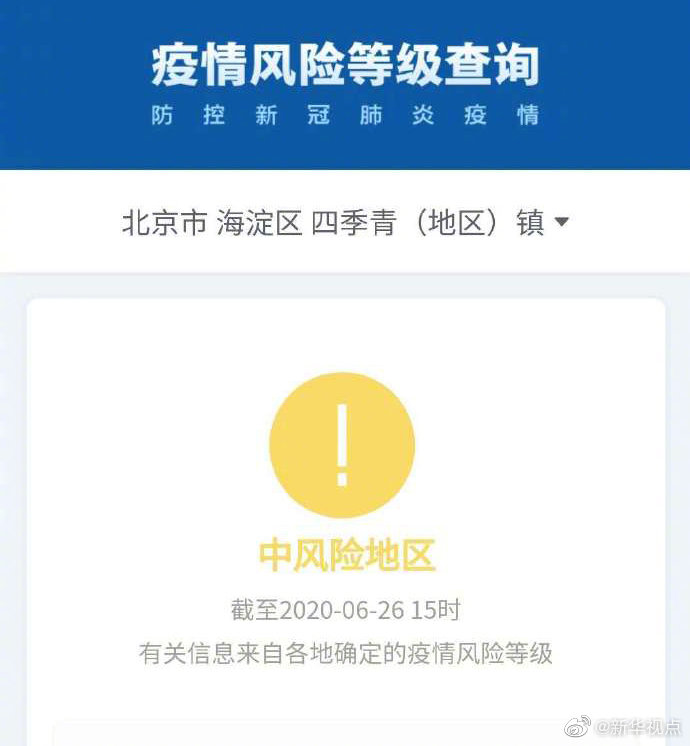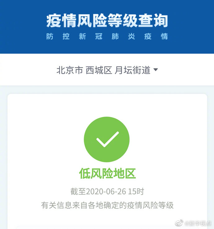 根據(jù)國(guó)務(wù)院客戶端小程序“疫情風(fēng)險(xiǎn)等級(jí)查詢”,截至6月26日15時(shí),北京市西城區(qū)月壇街道由中風(fēng)險(xiǎn)地區(qū)變更為低風(fēng)險(xiǎn)地區(qū)。海淀區(qū)四季青(地區(qū))鎮(zhèn)、昌平區(qū)回龍觀街道升級(jí)為中風(fēng)險(xiǎn)地區(qū)。