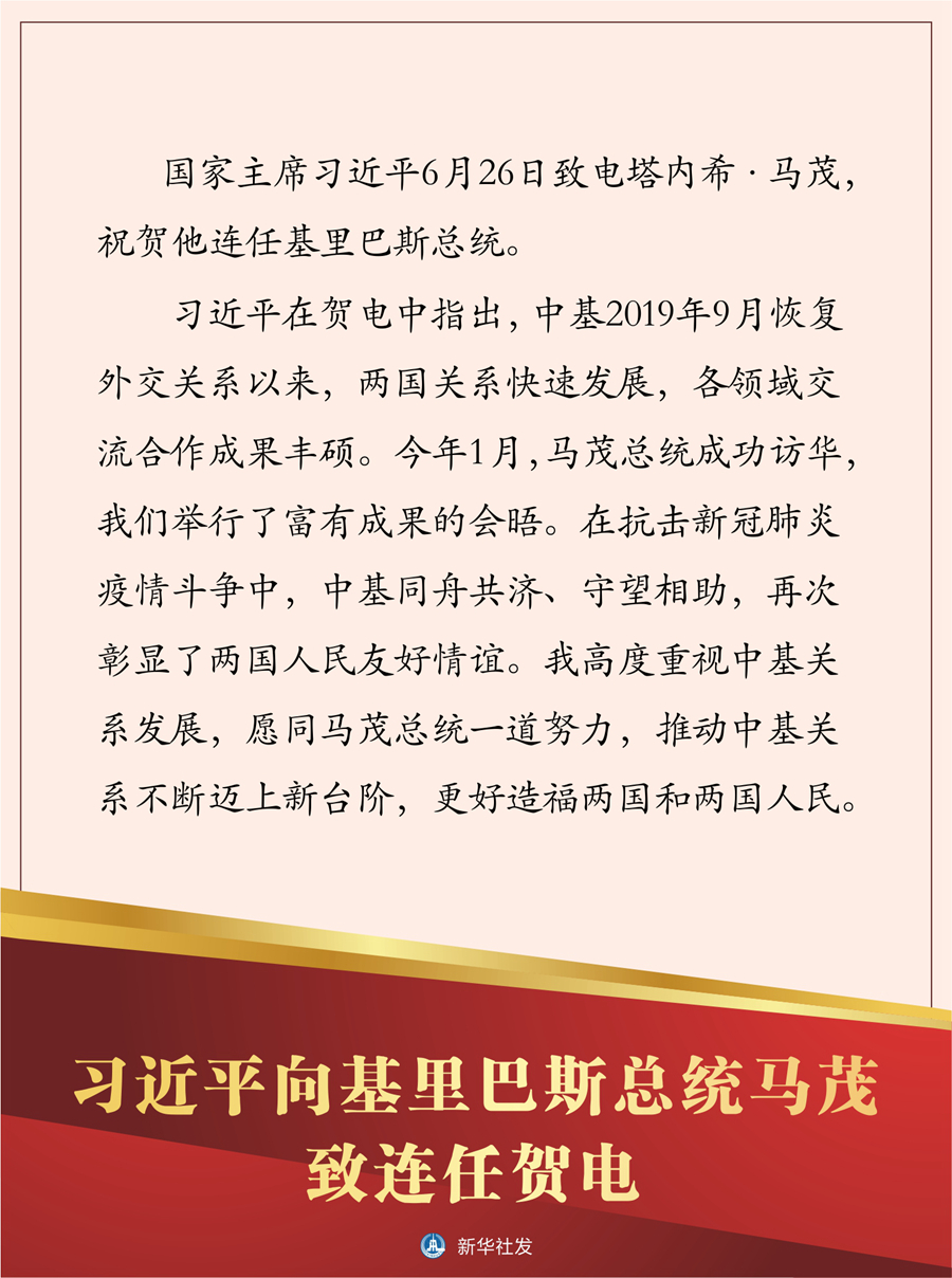 習近平在賀電中指出,中基2019年9月恢復(fù)外交關(guān)系以來,兩國關(guān)系快速發(fā)展,各領(lǐng)域交流合作成果豐碩。今年1月,馬茂總統(tǒng)成功訪華,我們舉行了富有成果的會晤。在抗擊新冠肺炎疫情斗爭中,中基同舟共濟、守望相助,再次彰顯了兩國人民友好情誼。我高度重視中基關(guān)系發(fā)展,愿同馬茂總統(tǒng)一道努力,推動中基關(guān)系不斷邁上新臺階,更好造福兩國和兩國人民。