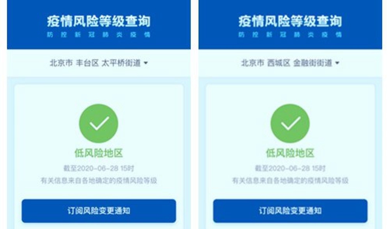 記者從國務(wù)院客戶端小程序“疫情風(fēng)險等級查詢”上了解到,截至6月28日15時,北京市西城區(qū)金融街街道、豐臺區(qū)太平橋街道由疫情中風(fēng)險地區(qū)變更為低風(fēng)險地區(qū)。