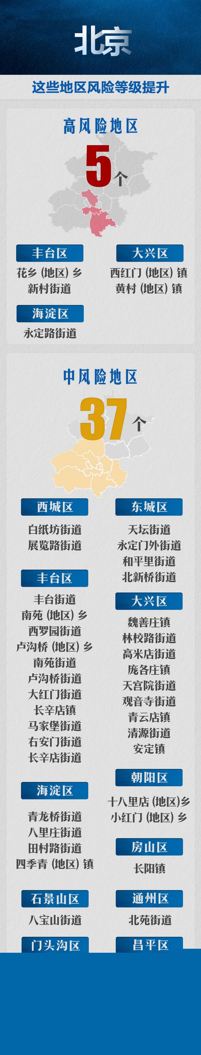目前,北京有5個高風(fēng)險區(qū)和37個中風(fēng)險區(qū)。