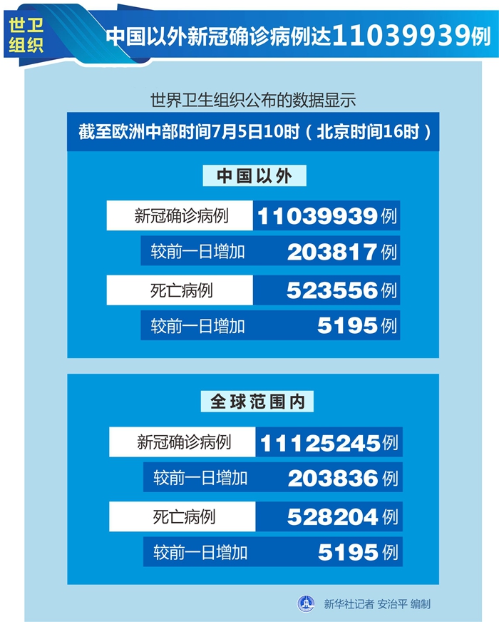 世衛(wèi)組織每日疫情報(bào)告顯示,截至歐洲中部時(shí)間5日10時(shí)(北京時(shí)間16時(shí)),中國以外新冠確診病例較前一日增加203817例,達(dá)到11039939例;中國以外死亡病例較前一日增加5195例,達(dá)到523556例。