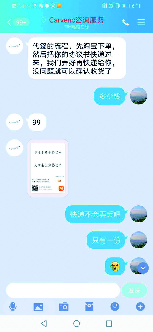 記者調(diào)查發(fā)現(xiàn),一些學(xué)校周邊打印店和淘寶賣(mài)家,也公然做起簽字蓋章生意?!皩?shí)在找不到工作單位的,我給你們支個(gè)招,去打印店搞一下,十幾元就能搞定?!睘樽寣W(xué)生盡快在大學(xué)生就業(yè)服務(wù)平臺(tái)登記、更新就業(yè)信息,安徽農(nóng)業(yè)大學(xué)經(jīng)濟(jì)技術(shù)學(xué)院某班主任在班級(jí)群里,發(fā)了一個(gè)可代簽三方協(xié)議的聯(lián)系人方式。