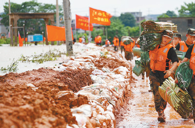 11日,武警戰(zhàn)士在江西鄱陽縣鄱陽鎮(zhèn)江家?guī)X村搬運抗洪物資。新華社記者 周 密攝