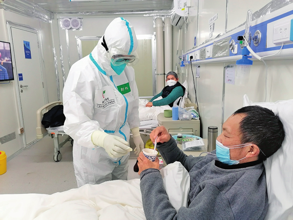 3月18日,武漢雷神山醫(yī)院,新冠肺炎患者在病房服用中藥湯藥治療