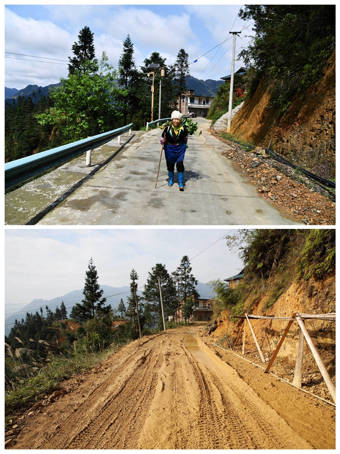 拼版照片的上圖為2020年3月31日,下地勞作歸來的村民走在貴州省從江縣加勉鄉(xiāng)真由村新修的通村公路上(新華社記者 楊文斌 攝);下圖為2016年12月3日拍攝的從江縣加勉鄉(xiāng)真由村的通村道路(貴州橋梁集團(tuán)供圖)。新華社發(fā)
