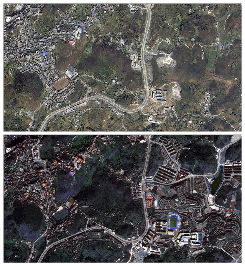 拼版照片的上圖為2015年建設(shè)前的貴州省晴隆縣三寶街道阿妹戚托小鎮(zhèn)衛(wèi)星地圖截圖(以公路為界:右為阿妹戚托小鎮(zhèn),左為晴隆縣城);下圖為2019年建設(shè)完成后的阿妹戚托小鎮(zhèn)衛(wèi)星地圖截圖。新華社發(fā)(貴州省測繪資料檔案館供圖)