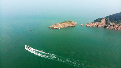 7月16日,“擁軍船”在蘇山島海域航行(無人機(jī)照片)。新華社記者 王凱 攝