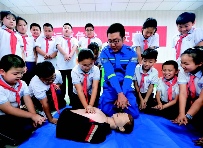 6月23日,山東省青島市即墨區(qū)藍天救援隊的志愿者為華山路小學(xué)的學(xué)生講解心肺復(fù)蘇技能 梁孝鵬攝