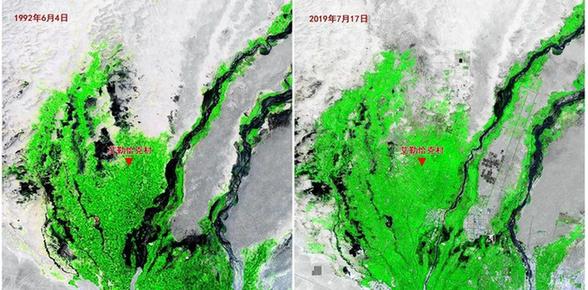 總面積0.66平方千米的艾勒恰克村地處沙漠邊緣,從遙感衛(wèi)星上可以看出自上個(gè)世紀(jì)90年代至今,沙漠邊緣地帶發(fā)生的一些變化。沙退了,綠色多了,農(nóng)村公路網(wǎng)織密起來(lái)。